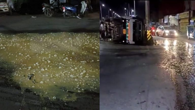The Duniyadari: बिलासपुर- तिफरा ओवरब्रिज पर आज अजब नजारा देखने को मिला, जहां सड़क अंडा-अंडा हो गया. दरअसल, अंडों से भरा एक ट्रक अनियंत्रित होकर डिवाइडर से टकरा गया और पलट गया. इस हादसे में ट्रक में लोड हजारों अंडे सड़क पर बिखर गए और पूरा रास्ता अंडों से पट गया, जिससे वहां फिसलन हो गई.