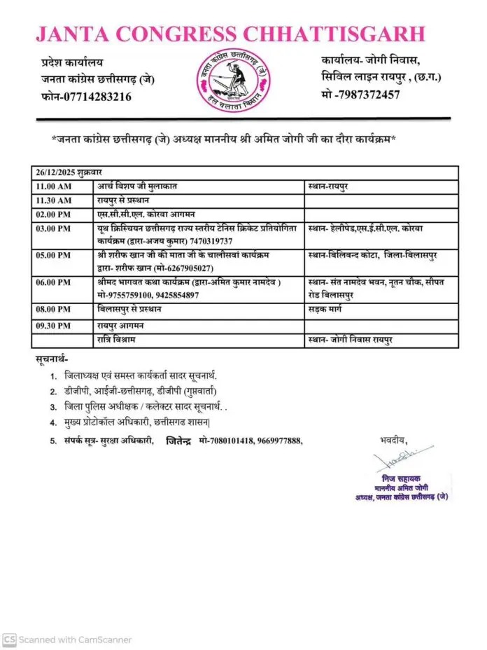 The Duniyadari : रायपुर | जनता कांग्रेस छत्तीसगढ़ (जे) के प्रदेश अध्यक्ष श्री अमित जोगी शुक्रवार, 26 दिसंबर 2025 को कोरबा और बिलासपुर का एकदिवसीय प्रवास करेंगे। इस दौरान वे सामाजिक, धार्मिक और खेलकूद से जुड़े विभिन्न कार्यक्रमों में शामिल होंगे।