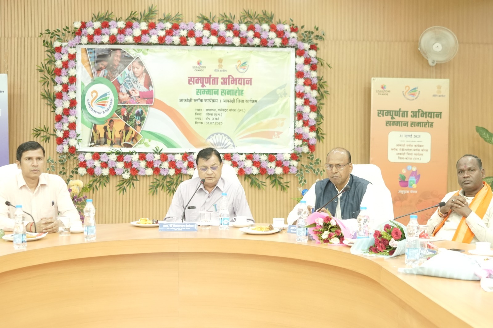 संपूर्णता अभियान आकांक्षी जिलों एवं ब्लॉकों के लिए एक ऐतिहासिक पहल रही, जिसका उद्देश्य प्रमुख 6 प्रदर्शन संकेतकों में पूर्णता प्राप्त करना था। कलेक्टर श्री अजीत वसंत के मार्गदर्शन एवं ब्लॉक अधिकारियों, स्वयं सहायता समूहों, फ्रंटलाइन वर्कर्स तथा विभिन्न विभागीय टीमों के समन्वित प्रयास से कोरबा ने आकांक्षी जिला कार्यक्रम के 6 में से 5 संकेतकों में उत्कृष्ट उपलब्धि प्राप्त की। कोरबा आकांक्षी ब्लॉक 6 में से 5 संकेतकों में शत प्रतिशत उपलब्धि वहीं पोड़ी उपरोड़ा आकांक्षी ब्लॉक 6 में से 4 संकेतकों में शत प्रतिशत उपलब्धि रही। इस सफलता पर कोरबा ब्लॉक को सिल्वर मेडल एवं पोड़ी उपरोड़ा ब्लॉक को कांस्य पदक प्रदान किया गया।