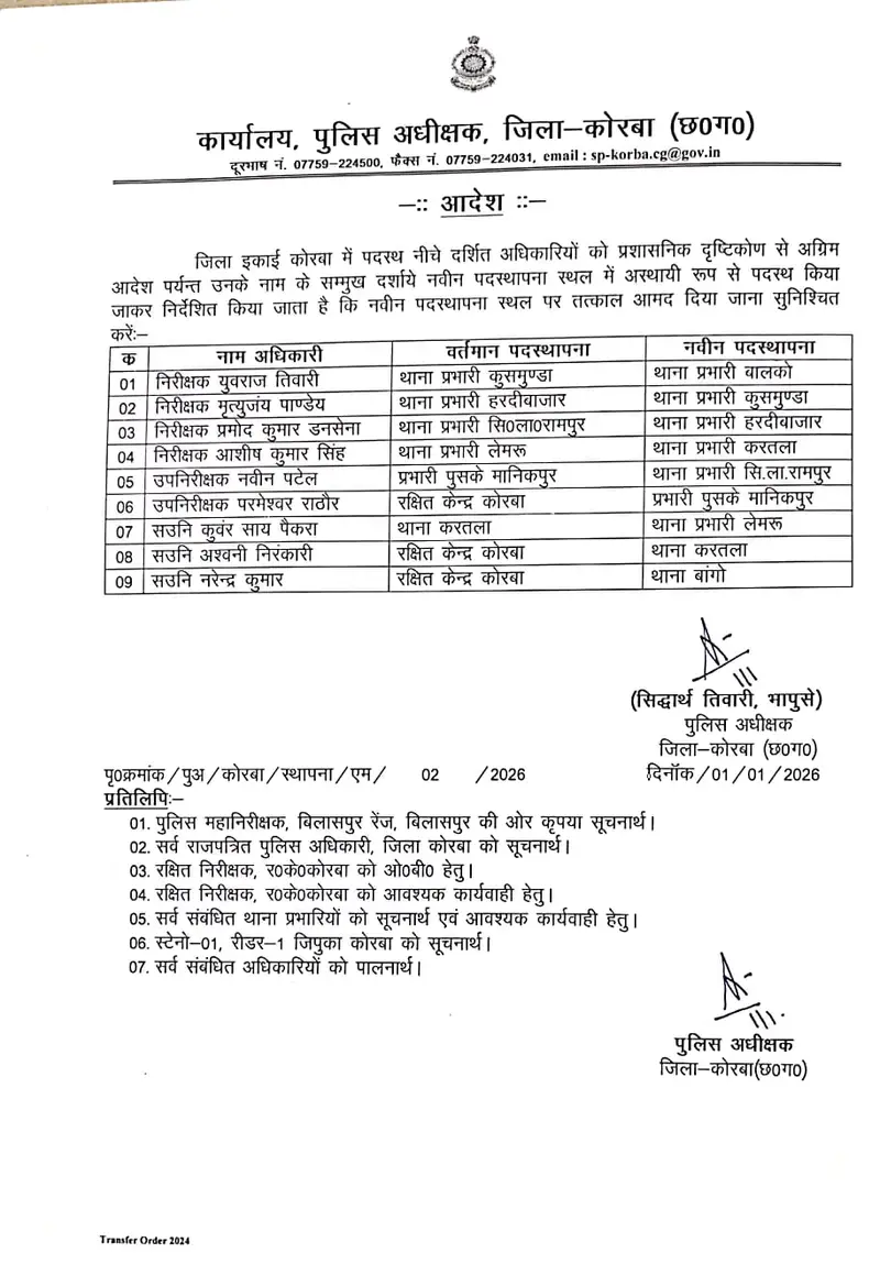 The Duniyadari : कोरबा। जिले की पुलिस व्यवस्था को और अधिक चुस्त-दुरुस्त बनाने के लिए पुलिस प्रशासन ने व्यापक स्तर पर तबादले किए हैं। कुसमुंडा, हरदीबाजार, रामपुर समेत कई थानों और चौकियों में नए प्रभारियों की नियुक्ति की गई है। यह निर्णय प्रशासनिक जरूरतों और क्षेत्र में कानून-व्यवस्था को मजबूत करने के उद्देश्य से लिया गया है।
