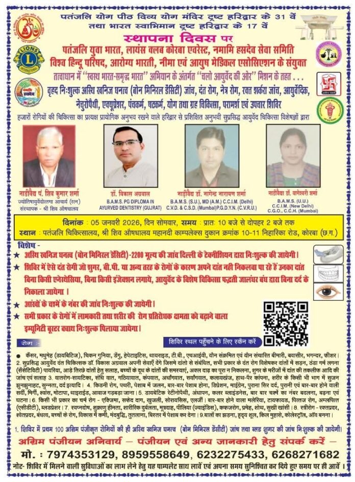 कोरबा में 5 जनवरी को विशाल निःशुल्क आयुर्वेद–योग एवं दंत चिकित्सा शिविर, पहले 100 मरीजों की BMD जांच मुफ्त