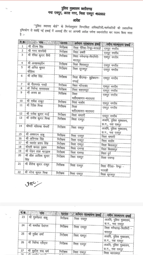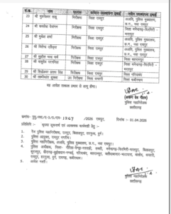 The Duniyadari: रायपुर, 01 मार्च। छत्तीसगढ़ पुलिस मुख्यालय ने प्रशासनिक व्यवस्था को मजबूत करने के उद्देश्य से पुलिस विभाग में बड़ा फेरबदल किया है। जारी आदेश के अनुसार कुल 30 पुलिस अधिकारियों के तबादले किए गए हैं। इनमें 29 थाना प्रभारी (TI) और 1 सब-इंस्पेक्टर (SI) शामिल हैं।