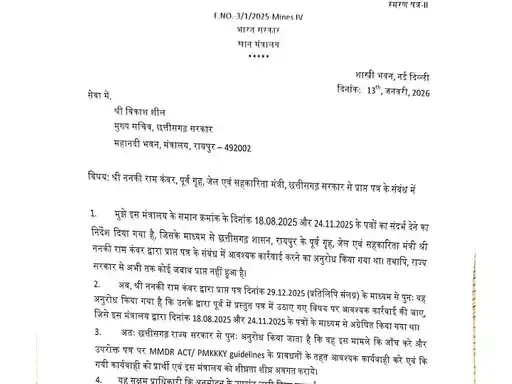 The Duniyadari :कोरबा। डिस्ट्रिक्ट मिनरल फंड (DMF) के कथित गलत इस्तेमाल को लेकर केंद्र सरकार ने छत्तीसगढ़ शासन के मुख्य सचिव विकास शील को स्मरण पत्र जारी किया है। यह कदम भाजपा के वरिष्ठ आदिवासी नेता और पूर्व गृहमंत्री ननकी राम कंवर की शिकायत के बाद उठाया गया है। शिकायत में बालको क्षेत्र की एक सड़क परियोजना में डीएमएफ राशि के उपयोग पर गंभीर सवाल खड़े किए गए हैं।