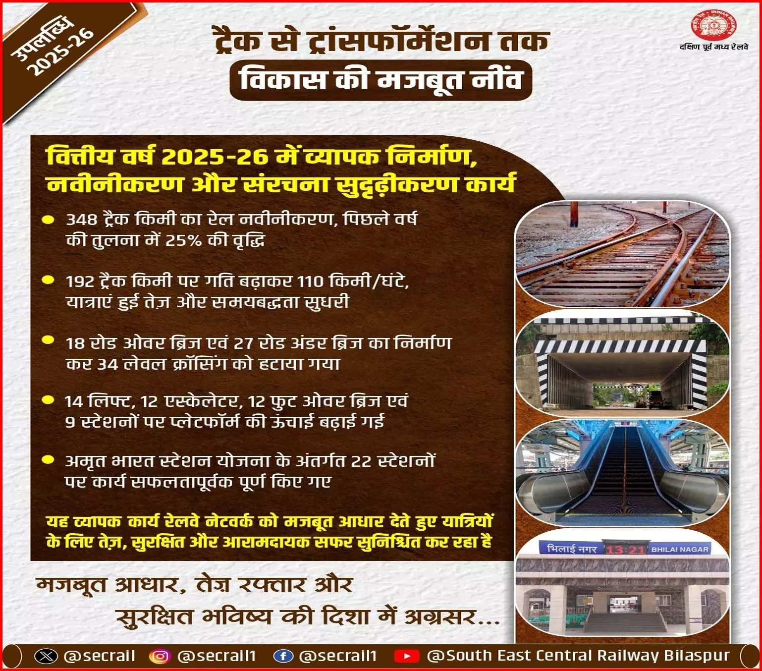 इन सभी उपलब्धियों के साथ दक्षिण पूर्व मध्य रेलवे ने भविष्य के लिए मजबूत आधार तैयार किया है। रेलवे का यह प्रयास आने वाले समय में तेज, सुरक्षित और भरोसेमंद रेल यात्रा को नए स्तर पर ले जाने में महत्वपूर्ण भूमिका .