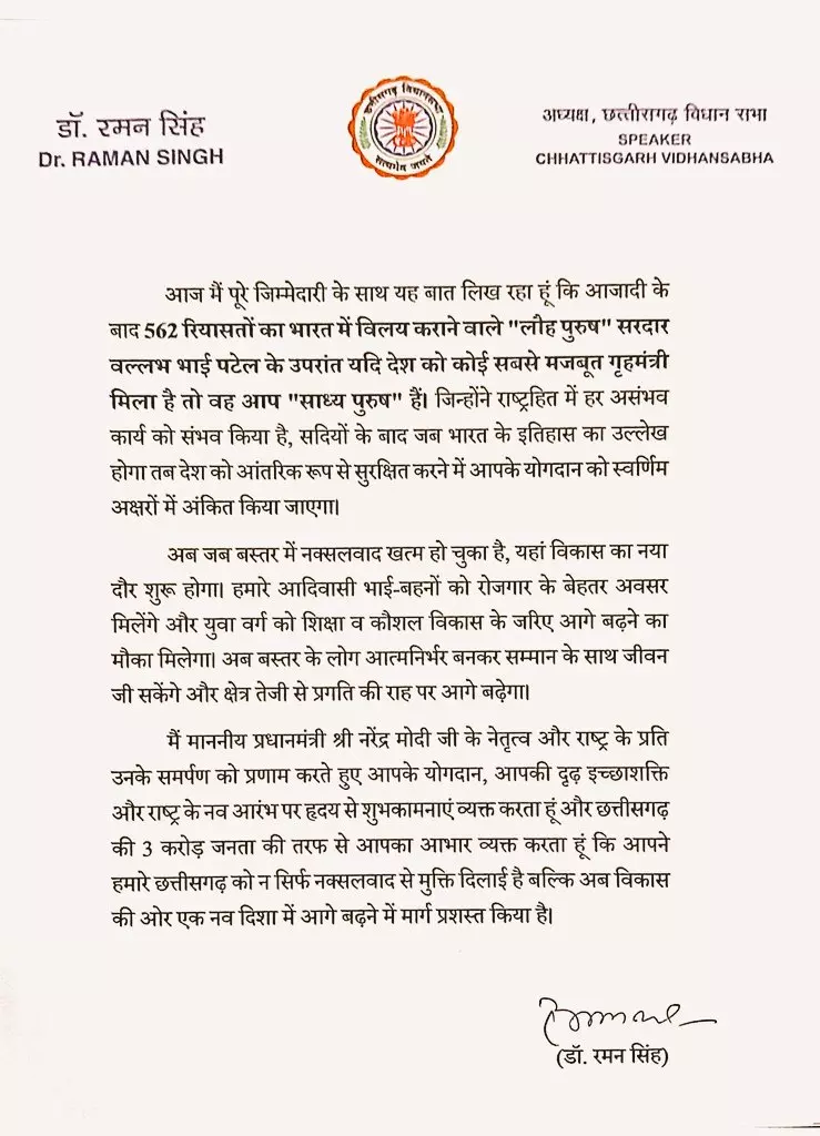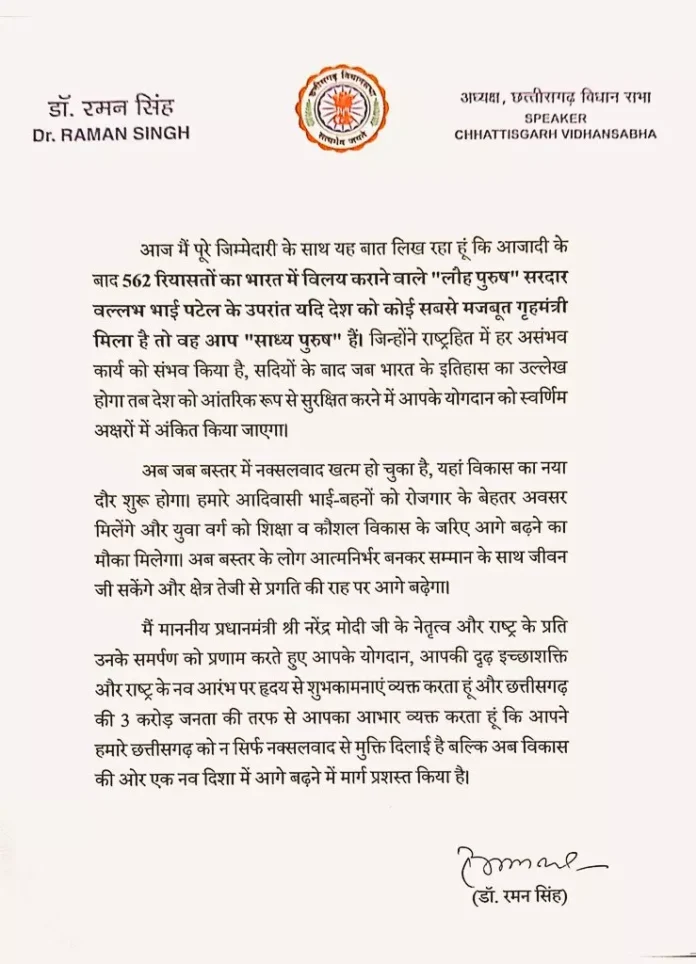 अपने पत्र में रमन सिंह ने लिखा कि असंभव को संभव बनाने वाले केंद्रीय गृह मंत्री ने भारत को नक्सलवाद की पीड़ा से बाहर निकालने की दिशा में महत्वपूर्ण कार्य किया है। उन्होंने कहा कि इस पहल से देश की आंतरिक सुरक्षा को मजबूती मिली है और प्रभावित क्षेत्रों में विकास का रास्ता साफ हुआ है।