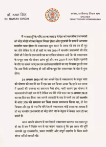 उन्होंने पत्र में नरेंद्र मोदी के नेतृत्व का भी उल्लेख करते हुए कहा कि देश अब विकास की नई दिशा में आगे बढ़ेगा और नक्सल प्रभावित क्षेत्रों में भी बुनियादी सुविधाओं और योजनाओं का लाभ तेजी से पहुंचेगा।