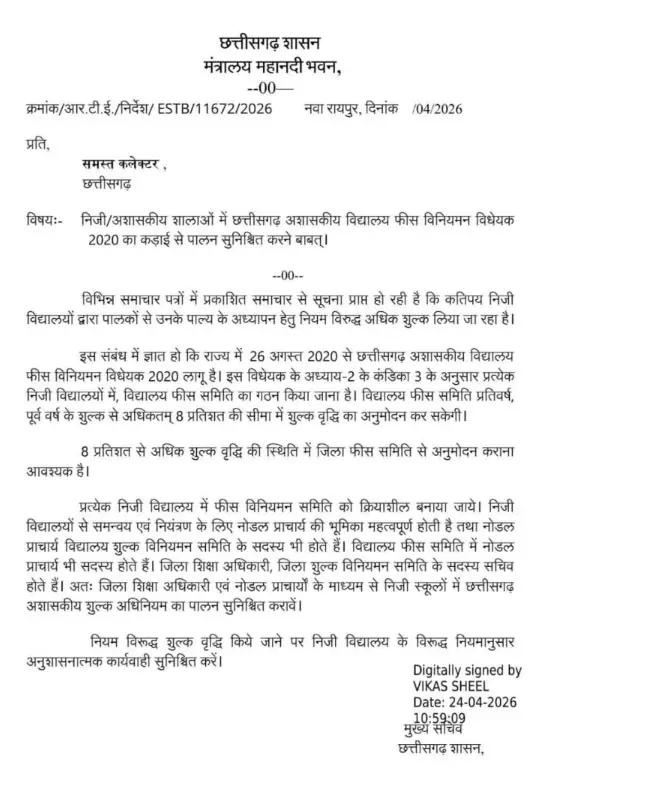 The Duniyadari: छत्तीसगढ़ में निजी स्कूलों द्वारा मनमानी फीस वसूली को लेकर अब प्रशासन सख्त हो गया है। मुख्य सचिव अमिताभ जैन ने सभी जिला कलेक्टरों को निर्देश जारी करते हुए कहा है कि राज्य में लागू फीस विनियमन कानून का कड़ाई से पालन सुनिश्चित किया जाए।