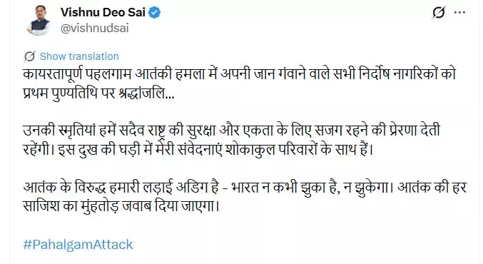 सीएम साय ने अपने संदेश में कहा कि यह घटना देश के लिए अत्यंत पीड़ादायक रही है और इस दुखद अवसर पर उनकी संवेदनाएं पीड़ित परिवारों के साथ हैं। उन्होंने दोहराया कि आतंकवाद के खिलाफ भारत की लड़ाई पूरी मजबूती के साथ जारी रहेगी और देश किसी भी प्रकार के दबाव में नहीं झुकेगा।