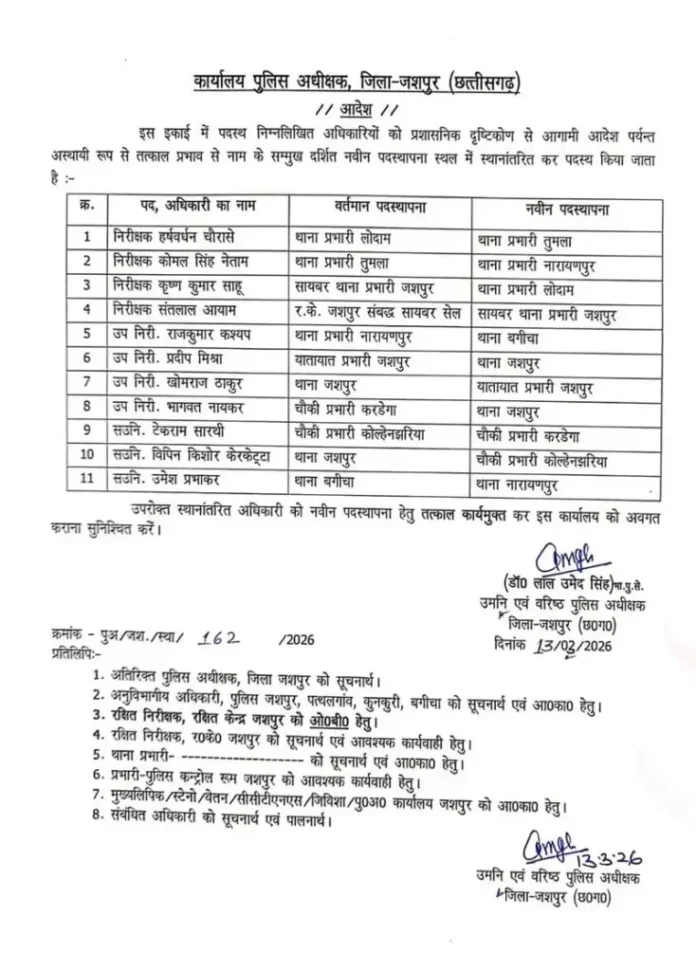 The Duniyadari: जशपुर। जिले में कानून-व्यवस्था को और अधिक सुदृढ़ करने तथा पुलिस व्यवस्था में अनुशासन बनाए रखने के उद्देश्य से पुलिस विभाग में बड़ा प्रशासनिक बदलाव किया गया है। पुलिस कप्तान एवं डीआईजी डॉ. लाल उमेद सिंह की अनुशंसा पर जारी आदेश के तहत जिले के विभिन्न थानों में पदस्थ कई अधिकारियों के तबादले किए गए हैं।