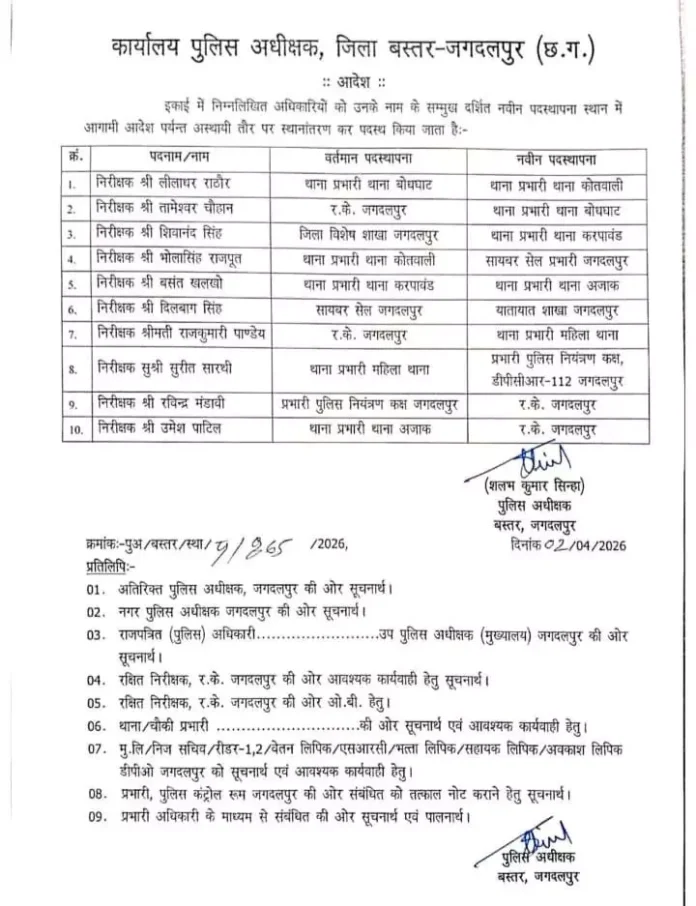 The Duniyadari: जगदलपुर- बस्तर जिले के पुलिस विभाग में प्रशासनिक कसावट लाने के उद्देश्य से बड़े पैमाने पर तबादले किए गए हैं। शलभ सिंहा ने आदेश जारी करते हुए 10 थाना प्रभारियों की जिम्मेदारियों में बदलाव किया है।