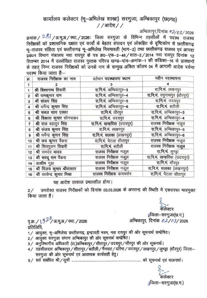 The Duniyadari: अंबिकापुर। जिले के राजस्व प्रशासन में बड़ा फेरबदल करते हुए कलेक्टर अजित बसंत ने विभिन्न तहसीलों में पदस्थ 16 राजस्व निरीक्षकों के तबादले के आदेश जारी किए हैं। प्रशासनिक कसावट और कार्यों में तेजी लाने के उद्देश्य से यह बदलाव किया गया है। जारी आदेश के बाद संबंधित अधिकारियों को नई पदस्थापना स्थल पर तत्काल प्रभाव से कार्यभार ग्रहण करने के निर्देश दिए गए हैं।