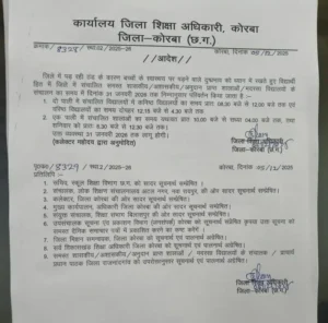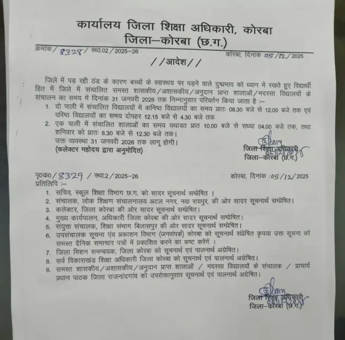 The Duniyadari : कोरबा: कोरबा में लगातार गिरते तापमान और ठिठुरन भरी सुबहों को देखते हुए जिला शिक्षा अधिकारी ने स्कूलों के संचालन समय में तत्काल प्रभाव से बड़े बदलाव किए हैं। आदेश के मुताबिक अब जिले के सभी शासकीय, अशासकीय, अनुदान प्राप्त और मदरसा स्कूल नई समय-सारिणी के अनुसार ही संचालित होंगे।