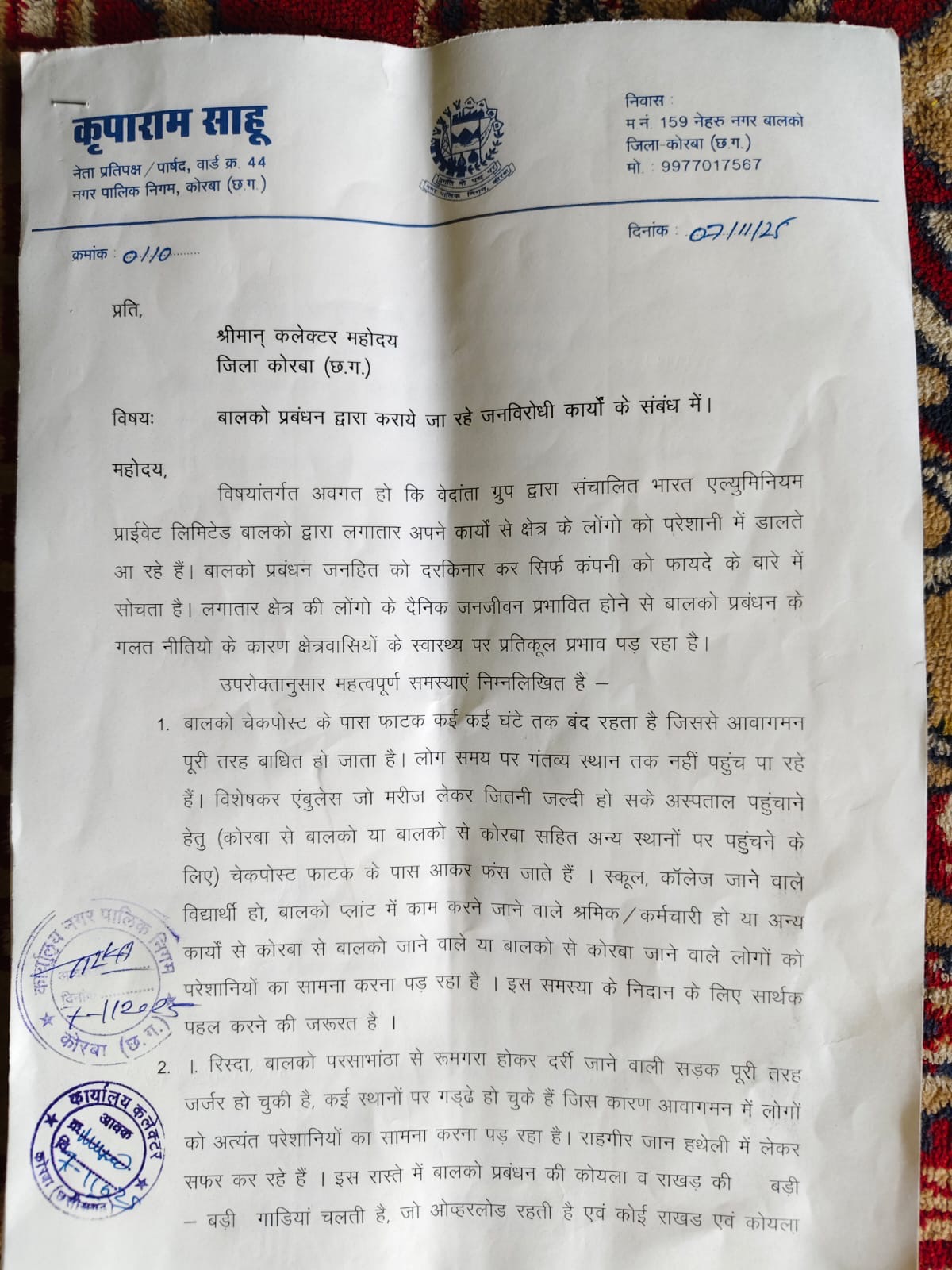 The Duniyadari : कोरबा। नगर पालिक निगम क्षेत्र के वार्ड क्रमांक 44 के पार्षद कुपाराम साहू ने बालको प्रबंधन पर गंभीर आरोप लगाते हुए कलेक्टर को ज्ञापन सौंपा है। ज्ञापन में कहा गया है कि वेदांता समूह द्वारा संचालित भारत एल्युमिनियम कंपनी (बालको) की नीतियाँ स्थानीय जनता के खिलाफ काम कर रही हैं। प्रबंधन के कारण क्षेत्रवासियों को रोजमर्रा के कामकाज और स्वास्थ्य दोनों पर प्रतिकूल प्रभाव झेलना पड़ रहा है।