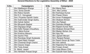 The Duniyadari : पटना । बिहार विधानसभा चुनाव के पहले चरण के लिए कांग्रेस पार्टी ने अपने 40 स्टार प्रचारकों की सूची घोषित कर दी है। इस सूची में पार्टी के शीर्ष नेतृत्व से लेकर नई पीढ़ी के नेताओं तक को जगह दी गई है।