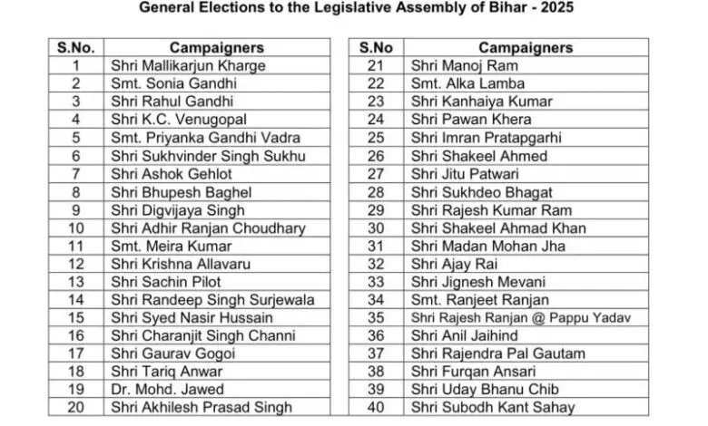 The Duniyadari : पटना । बिहार विधानसभा चुनाव के पहले चरण के लिए कांग्रेस पार्टी ने अपने 40 स्टार प्रचारकों की सूची घोषित कर दी है। इस सूची में पार्टी के शीर्ष नेतृत्व से लेकर नई पीढ़ी के नेताओं तक को जगह दी गई है।