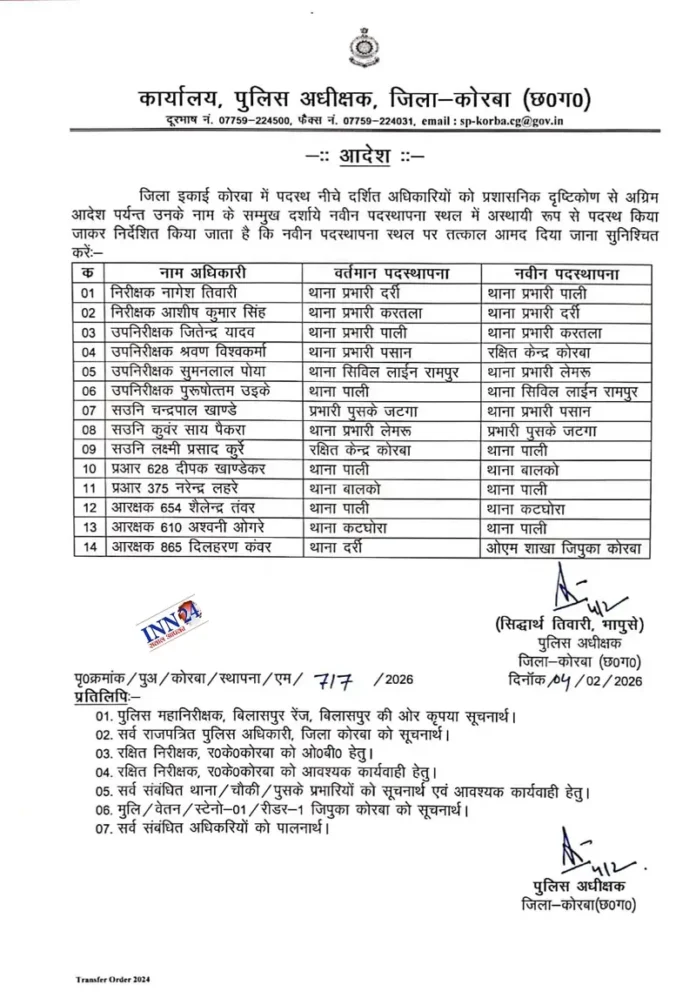 The Duniyadari: कोरबा। जिले में पुलिस विभाग में बड़ा प्रशासनिक फेरबदल किया गया है। दर्री, करतला, पाली सहित कई थानों के प्रभारियों को बदला गया है। इस आदेश के तहत थाना प्रभारियों के साथ-साथ कुल 14 पुलिसकर्मियों का तबादला किया गया है।