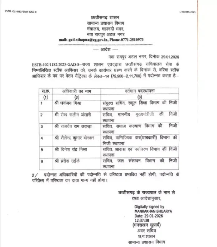 The Duniyadari : रायपुर। राज्य शासन के सामान्य प्रशासन विभाग ने मंत्रालय संवर्ग में एक और प्रशासनिक कदम उठाते हुए छह स्टाफ ऑफिसरों को पदोन्नति देकर वरिष्ठ स्टाफ ऑफिसर के पद पर नई जिम्मेदारी सौंपी है। इस संबंध में आदेश जारी कर दिए गए हैं, जो तत्काल प्रभाव से लागू होंगे।
