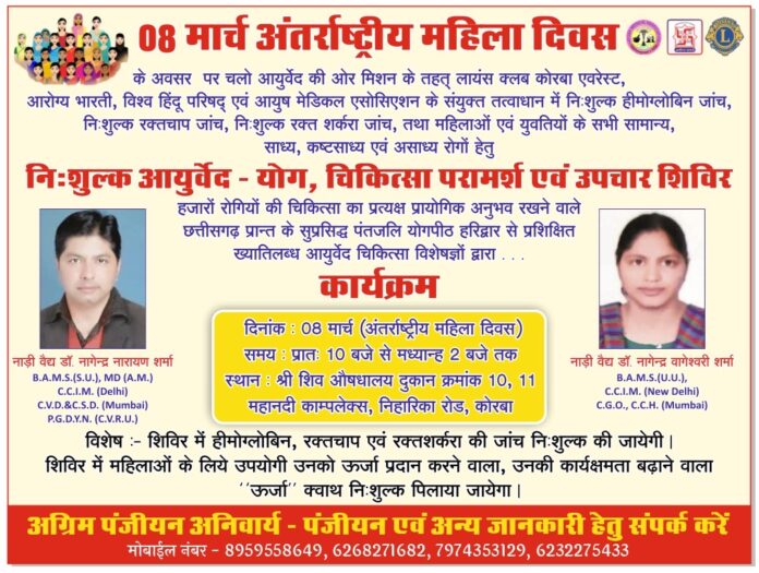 08 मार्च अंतराष्ट्रीय महिला दिवस के अवसर पर चलो आयुर्वेद की ओर मिशन के तहत निशुल्क हीमोग्लोबिन जांच, निःशुल्क रक्तचाप जांच, निशुल्क रक्त शर्करा जांच, तथा महिलाओं एवं युवतियों के सभी सामान्य, साध्य, कष्टसाध्य, एवं असाध्य रोगों हेतु निशुल्क आयुर्वेद-योग, चिकित्सा परामर्श शिविर दिनाँक 08 मार्च 2026 रविवार को लायंस क्लब कोरबा एवरेस्ट, विश्व हिंदू परिषद एवं आयुष मेडिकल एसोसिएशन के संयुक्त तत्वाधान में पतंजलि चिकित्सालय,श्री शिव औषधालय दुकान क्रमांक 10,11 महानदी काम्प्लेक्स निहारिका रोड कोरबा में प्रातः 10 बजे से मध्यान्ह 2 बजे तक आयोजित किया गया है। शिविर के विषय मे लायंस क्लब कोरबा एवरेस्ट के सचिव लायन डॉ.नागेंद्र नारायण शर्मा ने बताते हुए कहा कि इस शिविर में छत्तीसगढ़ प्रान्त के सुप्रसिद्ध पतंजलि योगपीठ हरिद्वार से प्रशिक्षित ख्यातिलब्ध चिकित्सिका नाड़ीवैद्या डॉ.वागेश्वरी शर्मा एवं मैं स्वयं अपनी चिकित्सकीय सेवायें देने हेतु उपस्थित रहूँगा ।शिविर मे हीमोग्लोबिन, रक्तचाप एवं रक्त शर्करा की जांच निशुल्क करने के साथ-साथ महिलाओं के लिये उपयोगी उनको ऊर्जा प्रदान करने वाला, उनकी कार्यक्षमता बढ़ाने वाला ऊर्जा क्वाथ निशुल्क पिलाया जायेगा। शिविर में महिलाओं एवं युवतियों के सभी सामान्य, साध्य, कष्टसाध्य, एवं असाध्य रोगों जैसे कैंसर, मधुमेह, थायरायड, ब्लडप्रेशर, श्वास, टी.बी.,लकवा, साइटिका, आस्टीयोपोरोसिस, गठियावात, पथरी, पीलिया, मस्तिष्कगत रोग माइग्रेन, डिप्रेशन, अनिद्रा, अम्लपित्त, बवासीर, भगंदर, गैस, दुर्बलता, बन्ध्यत्व (स्त्री-पुरुष), श्वेत प्रदर, रक्त प्रदर, हृदय रोग, चर्मरोग, सोरायसिस, एक्जिमा, शीतपित्त आदि का त्रिविध प्रकार से स्वास्थ्य परीक्षण कर संबंधित रोग के नियंत्रण एवं उपचार हेतु परामर्श के साथ साथ उनके लिये उपयोगी योगाभ्यास तथा प्राणायाम का व्यक्तिगत रूप से अभ्यास कराकर विशेष प्रायोगिक प्रशिक्षण भी देंगे। साथ ही रोगियों को उनके लिये उपयोगी जीवनशैली के बारे में भी व्यक्तिगतरूप से परामर्श देने के साथ साथ उनके लिये लाभकारी दिनचर्या-ऋतुचर्या, आहार-विहार के विषय मे व्यक्तिगतरूप से विस्तार से परामर्श देंगे। लायंस क्लब कोरबा एवरेस्ट के सचिव लायन डॉ.नागेंद्र नारायण ने अंचलवासियों से 8 मार्च अंतर्राष्ट्रीय महिला दिवस के अवसर पर चलो आयुर्वेद की ओर मिशन के तहत निशुल्क हीमोग्लोबिन जांच, निःशुल्क रक्तचाप जांच, निशुल्क रक्त शर्करा जांच, तथा महिलाओं एवं युवतियों के सभी सामान्य, साध्य, कष्टसाध्य, एवं असाध्य रोगों हेतु आयोजित इस विशेष शिविर का लाभ उठाने की अपील की है।शिविर का लाभ उठाने हेतु, पंजीयन कराने एवं अन्य जानकारी हेतु मोबाइल नंबर 9826111738 पर संपर्क कर जांच हेतु निर्