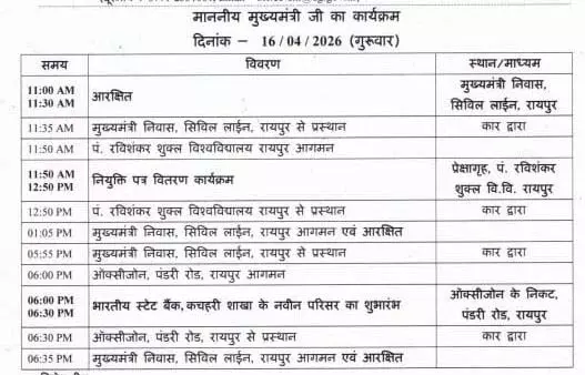 कार्यक्रम के बाद मुख्यमंत्री दोपहर 1:05 बजे सिविल लाइन स्थित अपने निवास लौटेंगे, जहां वे प्रशासनिक कार्यों की समीक्षा करेंगे और आवश्यक बैठकों में हिस्सा लेंगे।