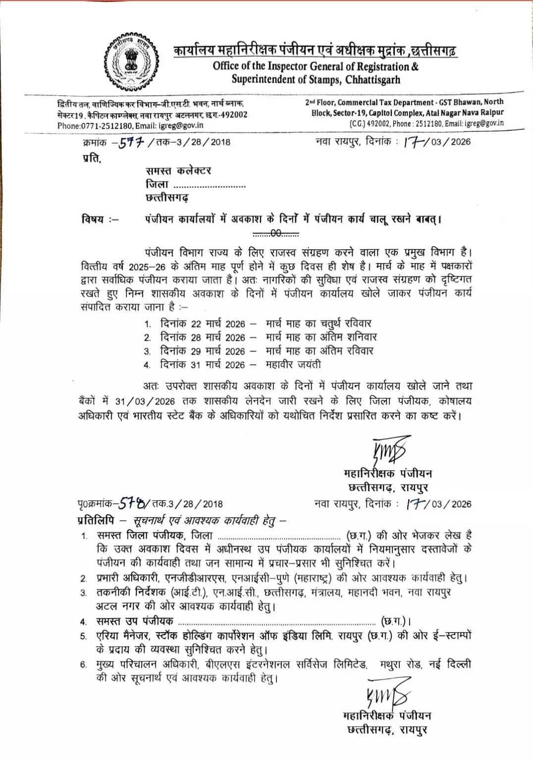 निर्देश के तहत इन अवकाश दिनों में भी पंजीयन कार्यालयों में सामान्य रूप से दस्तावेजों के पंजीयन का कार्य किया जाएगा। साथ ही 31 मार्च तक बैंकिंग लेनदेन निर्बाध रूप से जारी रखने के निर्देश भी दिए गए हैं, ताकि स्टाम्प शुल्क और पंजीयन से संबंधित राजस्व प्रक्रिया प्रभावित न हो।