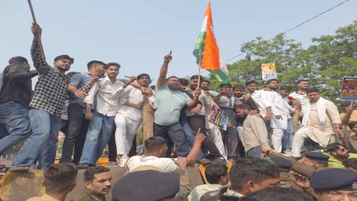रायपुर में युवा कांग्रेस का प्रदर्शन, भाजपा कार्यालय की ओर कूच; बैरिकेडिंग पर रोका गया