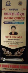 फ़ोटो- लायन डॉ.नागेन्द्र नारायण शर्मा को लायंस गौरव सम्मान से सम्मानित करती मंदाकिनी एवं अन्य अतिथिगण ।
