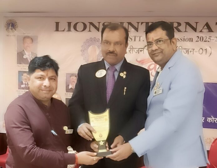 फ़ोटो- लायन डॉ.नागेन्द्र नारायण शर्मा को सम्मानित करते डिस्ट्रिक्ट गवर्नर लायन विजय अग्रवाल एवं रीजन चेयरपर्सन कैलाश गुप्ता।