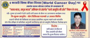 The Duniyadari: 4 फरवरी विश्व कैंसर दिवस पर वर्ल्ड कैंसर डे की 2026 की थीम “यूनाइटेड बाय यूनीक” पर लायंस क्लब इंटरनेशनल डिस्ट्रिक्ट 3233 सी के डिस्ट्रिक्ट प्रोजेक्ट अवेयरनेस ऑफ पीडियाट्रिक कैंसर के अंतर्गत “चलो आयुर्वेद की ओर” मिशन के तहत लायंस क्लब एवरेस्ट (क्लब नंबर 096456) के तत्वाधान मे स्त्री, पुरुष एवं बच्चों में होने वाले सभी प्रकार के कैंसर पर जागरुकता कार्यक्रम तथा निशुल्क आयुर्वेद-योग चिकित्सा परामर्श एवं उपचार शिविर दिनांक 4 फरवरी 20256 बुधवार को पतंजलि आरोग्य केंद्र जैजैपुर प्रात: 10 से 1 बजे तक आयोजित है।