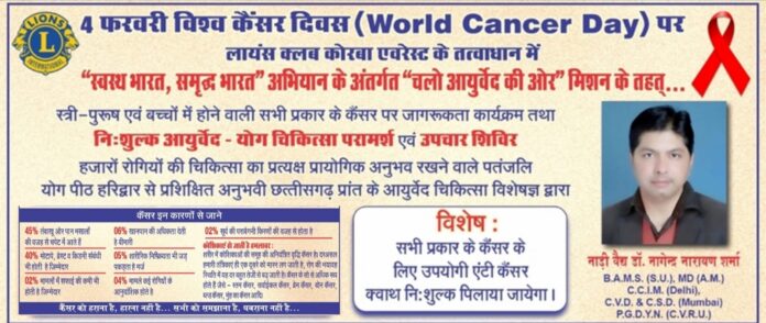 4 फरवरी विश्व कैंसर दिवस पर वर्ल्ड कैंसर डे की 2026 की थीम “यूनाइटेड बाय यूनीक” पर लायंस क्लब इंटरनेशनल डिस्ट्रिक्ट 3233 सी के डिस्ट्रिक्ट प्रोजेक्ट अवेयरनेस ऑफ पीडियाट्रिक कैंसर के अंतर्गत “चलो आयुर्वेद की ओर” मिशन के तहत लायंस क्लब एवरेस्ट (क्लब नंबर 096456) के तत्वाधान मे स्त्री, पुरुष एवं बच्चों में होने वाले सभी प्रकार के कैंसर पर जागरुकता कार्यक्रम तथा निशुल्क आयुर्वेद-योग चिकित्सा परामर्श एवं उपचार शिविर दिनांक 4 फरवरी 2026 बुधवार को पतंजलि आरोग्य केंद्र जैजैपुर में प्रात: 10 से 1 बजे तक आयोजित किया गया है। शिविर के विषय में पतंजलि आरोग्य केंद्र जैजैपुर के संचालक सुरेंद्र यादव ने बताते हुए कहा कि इस शिविर में छत्तीसगढ़ प्रांत के ख्यातिलब्ध आयुर्वेद चिकित्सक, लायंस क्लब एवरेस्ट के सचिव लायन नाड़ीवैद्य डॉ.नागेंद्र नारायण शर्मा अपनी चिकित्सकीय सेवायें प्रदान करेंगे।