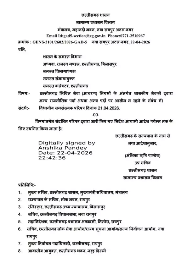 The Duniyadari: रायपुर- राज्य सरकार ने हाल ही में जारी उस आदेश को अस्थायी रूप से रोक दिया है, जिसमें सरकारी अधिकारी-कर्मचारियों को बिना पूर्व अनुमति किसी भी राजनीतिक या अन्य पद को स्वीकार करने से प्रतिबंधित किया गया था।