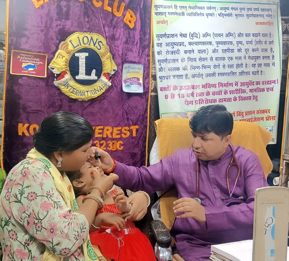 साथ ही बच्चों के स्वास्थ्य का निशुल्क चिकित्सकीय परीक्षण करने के साथ बच्चों के शारीरिक एवं मानसिक विकास के लिये बच्चों को एवं उनके अभिभावकों को बच्चों की आयुनुसार उनके लिए उपयोगी आहार विहार के विषय मे विस्तार से बताते हुए उनके लिए उपयोगी योग प्राणायाम का भी निशुल्क प्रशिक्षण दिया। स्वर्ण प्राशन के बारे में बताते हुए संस्थान के चिकित्सक नाड़ीवैद्य डॉ.नागेन्द्र नारायण शर्मा ने कहा कि स्वर्ण प्राशन शुद्ध स्वर्ण भस्म के साथ शहद, गोघृत, ब्राह्मी , वचा, गिलोय, अश्वगंधा, शंखपुष्पी आदि से बनी हुई दिव्य औषधि है। जो बच्चो को विलक्षण प्रतिभाशाली बनाने के लिये अमृततुल्य वरदान है। जिसे पुष्य नक्षत्र में देने से बच्चो की रोगप्रतिरोधक क्षमता बढ़ने के साथ साथ उनकी स्मरण शक्ति तीव्र होकर उनकी रचनात्मक एवं क्रियात्मक विकृतियां दूर होती हैं। शिविर में नाड़ीवैद्य डॉ.नागेन्द्र नारायण शर्मा, लायंस क्लब कोरबा एवरेस्ट के संरक्षक लायन सुधीर जैन, अध्यक्ष लायन शिव जायसवाल, कोषाध्यक्ष लायन गजेंद्र राठौड़, कार्यकारिणी सदस्य लायन प्रत्युष हनी सक्सेना पतंजलि युवा भारत के राज्य कार्यकारिणी सदस्य संजय कुर्मवंशी के अलावा नेत्रनन्दन साहू, अश्विनी बुनकर, कमल धारीया, देवबलि कुंभकार, राकेश इस्पात, सिद्धराम साहनी, नेहा महंत एवं श्री शिव औषधालय की संचालिका श्रीमती प्रतिभा शर्मा ने विशेष रूप से उपस्थित होकर अपना महत्वपूर्ण योगदान दिया।