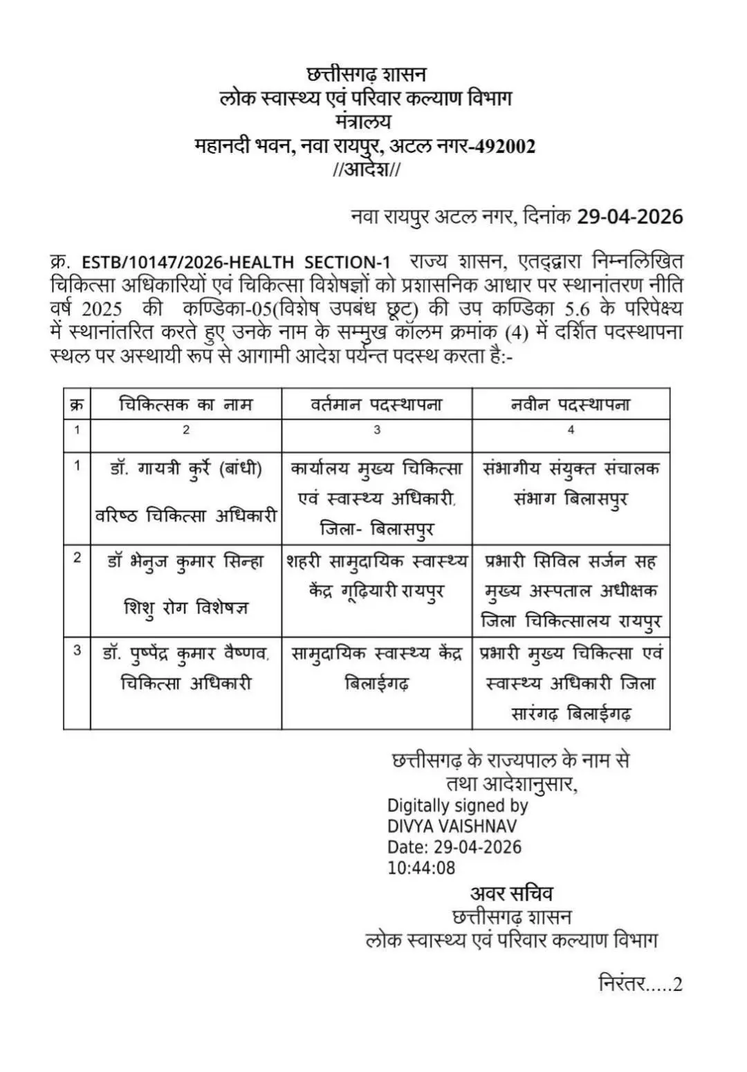 बताया जा रहा है कि यह तबादले नियमित प्रशासनिक प्रक्रिया के तहत किए गए हैं। संबंधित डॉक्टरों को जल्द ही अपने नए पदस्थापना स्थल पर कार्यभार ग्रहण करने के निर्देश दिए गए हैं।