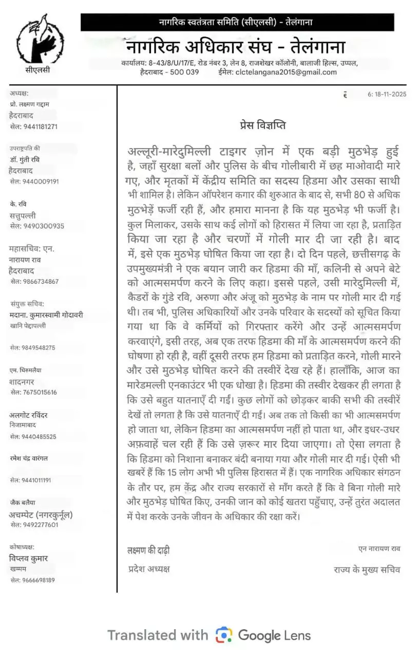 The Duniyadari : रायपुर/तेलंगाना: तेलंगाना की नागरिक अधिकार संस्था ने हाल ही में माडवी हिड़मा की मुठभेड़ को लेकर चिंता जताई है और इसे संदिग्ध बताया है। संगठन के प्रमुख एन. नारायण राव ने कहा कि अल्लूरी-मारेडुमिल्लि टाइगर क्षेत्र में सुरक्षा बलों के साथ मुठभेड़ में छह माओवादी मारे गए, जिनमें केंद्रीय समिति के सदस्य हिड़मा और उनका सहयोगी शामिल थे।