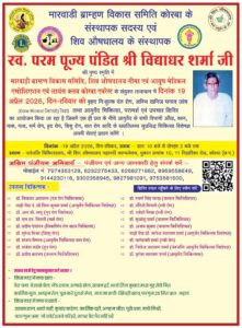 *19 अप्रैल मारवाड़ी ब्राह्मण विकास समिति के संस्थापक सदस्य एवं शिव औषधालय के संस्थापक स्वर्गीय परम पूज्य पंडित विद्याधर शर्मा जी की पुण्यतिथि के अवसर पर मारवाड़ी ब्राह्मण विकास समिति , शिव औषधालय, लायंस क्लब कोरबा एवरेस्ट, नीमा एवं आयुष मेडिकल एसोसिएशन के संयुक्त तत्वाधान में वृहद् निशुल्क दंत रोग, अस्थि खनिज, घनत्व जांच ( bone Minearal density test) तथा आयुर्वेद चिकित्सा परामर्श एवं उपचार शिविर पतंजलि चिकित्सालय, श्री शिव औषधालय दुकान क्रमांक 10,11 महानदी काम्प्लेक्स निहारिका रोड कोरबा में दिनांक 19 अप्रैल 2026 रविवार को प्रातः 10 बजे से 2 बजे तक आयोजित है ।*
