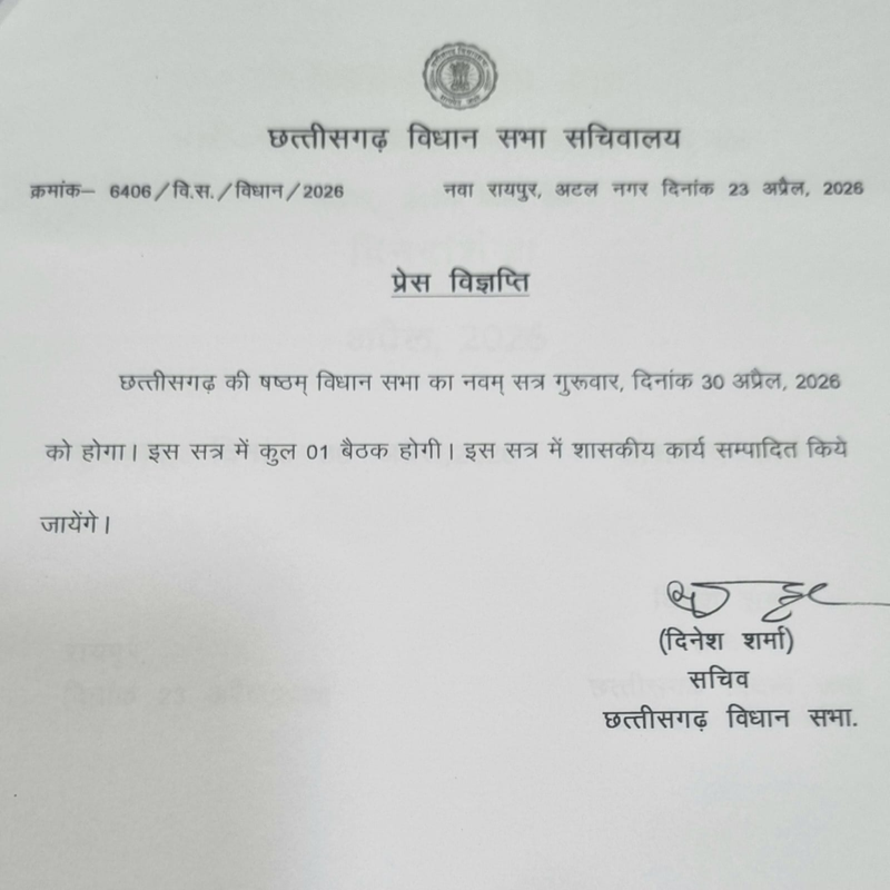 The Duniyadari: Raipur- छत्तीसगढ़ विधानसभा का अगला सत्र 30 अप्रैल 2026, गुरुवार को आयोजित किया जाएगा। विधानसभा सचिवालय की ओर से जारी आधिकारिक जानकारी के मुताबिक यह सत्र एक दिन का होगा, जिसमें केवल एक ही बैठक प्रस्तावित है।