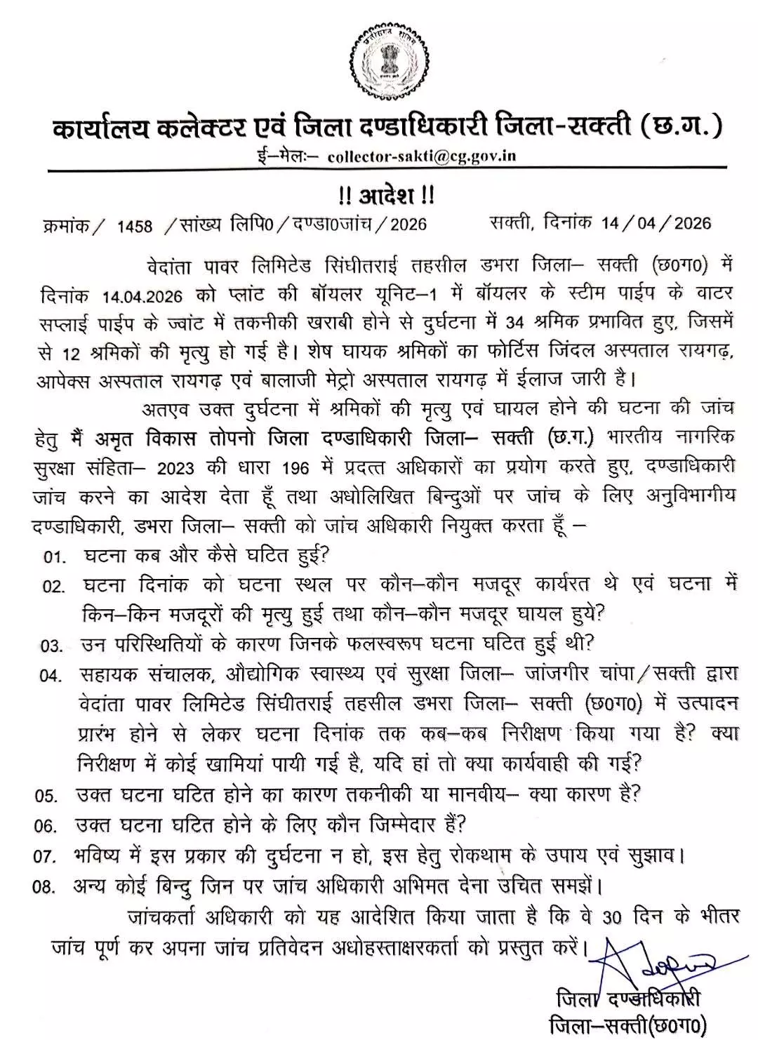 जारी आदेश के अनुसार 14 अप्रैल 2026 को वेदांता पावर लिमिटेड के बॉयलर यूनिट-1 में स्टीम पाइप से जुड़े वाटर सप्लाई पाइप के जॉइंट में तकनीकी खराबी आने के कारण बड़ा हादसा हुआ। इस दुर्घटना में कुल 34 श्रमिक प्रभावित हुए, जिनमें से 12 मजदूरों की मौत हो गई, जबकि अन्य घायल श्रमिकों का इलाज रायगढ़ के फोर्टिस जिंदल अस्पताल, एपेक्स अस्पताल और बालाजी मेट्रो अस्पताल में जारी है।