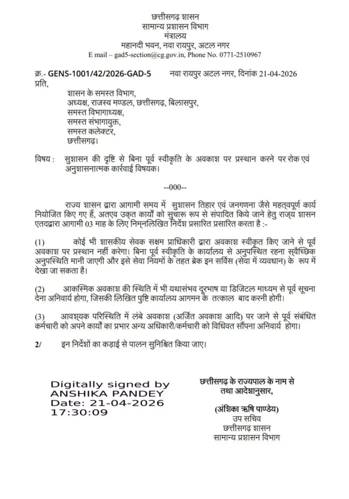 The Duniyadari: रायपुर-  राज्य सरकार ने आगामी सुशासन तिहार और जनगणना जैसे महत्वपूर्ण कार्यों को ध्यान में रखते हुए शासकीय कर्मचारियों की छुट्टियों को लेकर सख्त निर्देश जारी किए हैं। जारी आदेश के अनुसार अगले तीन माह तक बिना पूर्व अनुमति के कोई भी कर्मचारी अवकाश पर नहीं जा सकेगा।