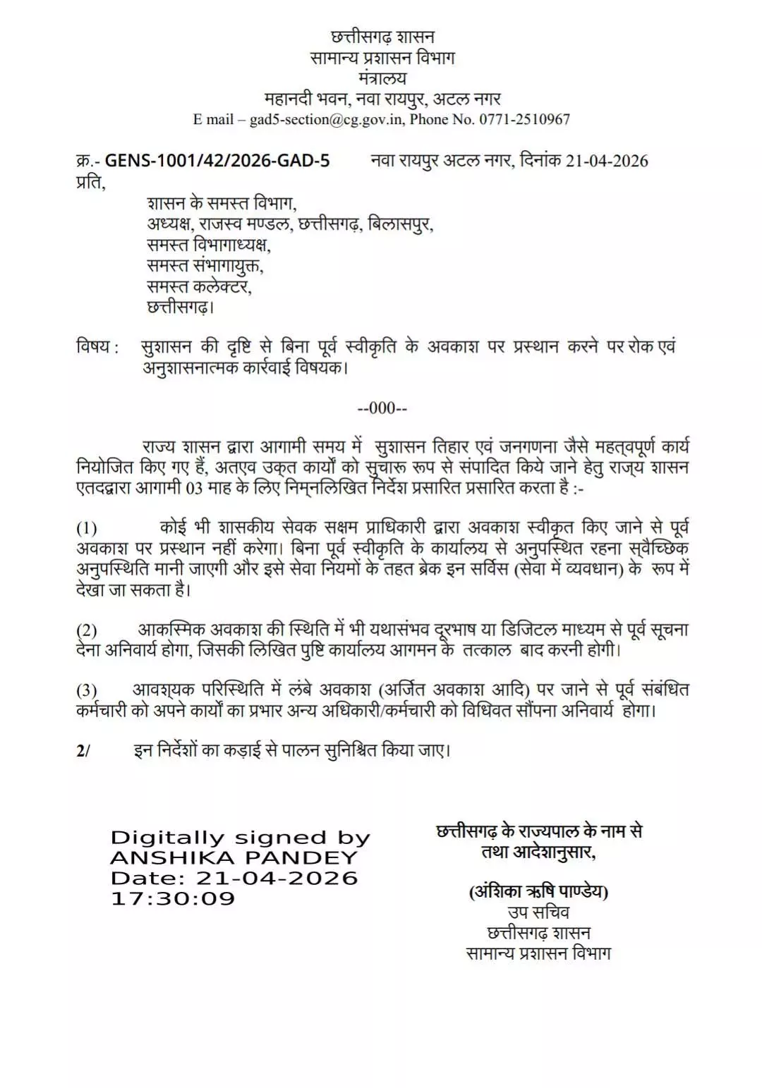 आदेश में यह भी कहा गया है कि आकस्मिक अवकाश की स्थिति में कर्मचारियों को यथासंभव फोन या डिजिटल माध्यम से पहले सूचना देना अनिवार्य होगा। इसके बाद कार्यालय में उपस्थित होने पर इसकी लिखित पुष्टि करनी होगी।