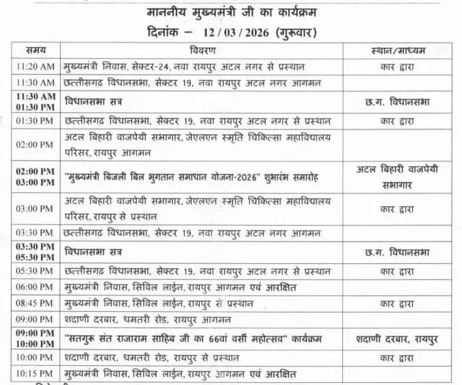 इसके बाद दोपहर 3:30 बजे वे फिर से विधानसभा पहुंचकर सत्र की कार्यवाही में शामिल होंगे। उसके बाद शाम 6 बजे मुख्यमंत्री सिविल लाइन स्थित अपने निवास पहुंचेंगे।