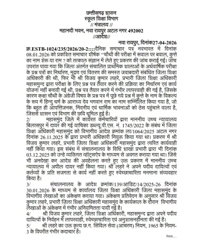 The Duniyadari: महासमुंद में शिक्षा विभाग ने बड़ी कार्रवाई करते हुए प्रभारी जिला शिक्षा अधिकारी विजय कुमार लहरे को तत्काल प्रभाव से निलंबित कर दिया है। उनके खिलाफ परीक्षा से जुड़े विवाद, कामकाज में लापरवाही और वित्तीय गड़बड़ियों जैसे गंभीर आरोप सामने आए थे।
