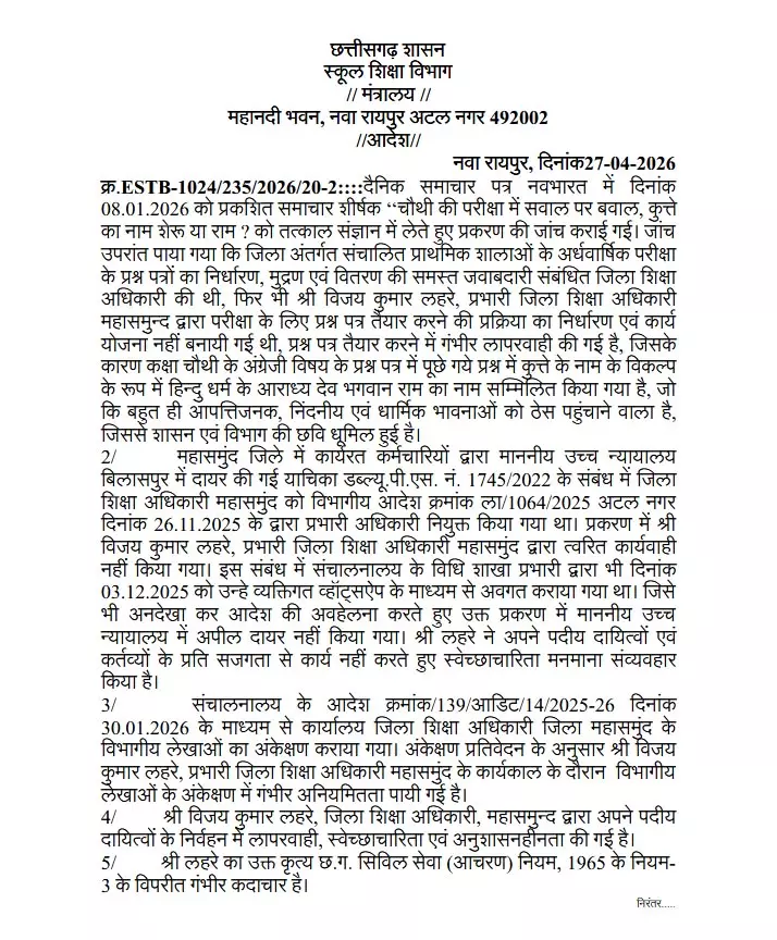 इधर, विभागीय कार्य प्रभावित न हों, इसके लिए उप संचालक बी.एल. देवांगन को महासमुंद DEO का अतिरिक्त प्रभार सौंपा गया है। शासन ने इस घटना को विभाग की छवि को नुकसान पहुंचाने वाला मानते हुए स्पष्ट किया है कि ऐसी लापरवाही बर्दाश्त नहीं की जाएगी।