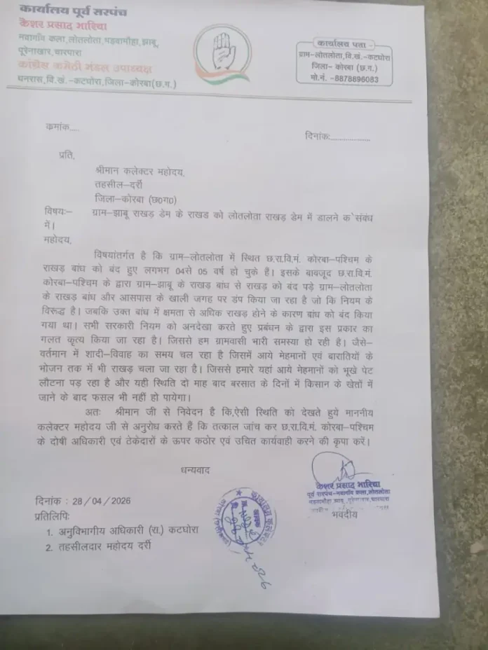The Duniyadari: कोरबा जिले के कटघोरा विकासखंड के ग्राम लोतलोता में एक बार फिर राखड़ (फ्लाई ऐश) डंप किए जाने का मामला सामने आया है। इसको लेकर स्थानीय ग्रामीणों में नाराजगी बढ़ती जा रही है। पूर्व सरपंच केशर प्रसाद भारिया ने कलेक्टर को ज्ञापन सौंपकर छत्तीसगढ़ राज्य विद्युत मंडल (कोरबा-पश्चिम) पर नियमों की अनदेखी का आरोप लगाया है।